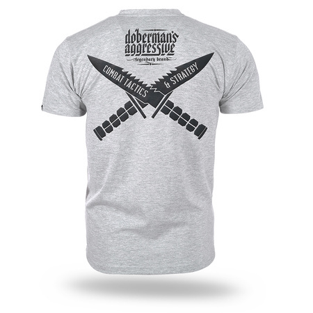 Wykonany z wysokiej jakości bawełny, zapewniającej komfort noszenia. Na plecach duży nadruk wykonany metodą 3D druku puchnącego, przedstawiający skrzyżowane taktyczne noże z ostrzami skierowanymi ku górze oraz napis "COMBAT TACTICS & STRATEGY". Nad grafiką logo marki "DOBERMANS AGGRESSIVE". Przód koszulki gładki, bez nadruku.