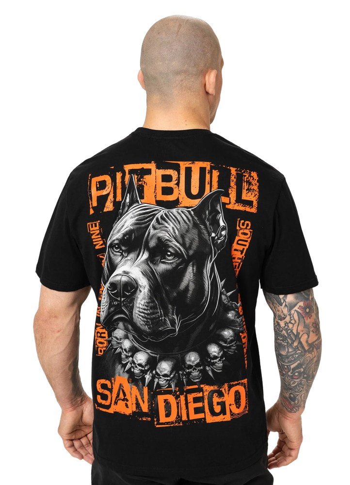 Męska koszulka Pit Bull West Coast Blacky w kolorze czarnym to idealna propozycja dla mężczyzn, którzy cenią sobie wyrazisty styl oraz najwyższą jakość wykonania. Ta unikalna koszulka z krótkim rękawem została zaprojektowana z myślą o osobach utożsamiających się z bezkompromisowym charakterem marki, co podkreśla dominujący na plecach duży nadruk z psem rasy pitbull. Grafika wykonana w wysokiej rozdzielczości przedstawia głowę psa w obroży z motywem czaszek, co nadaje całości agresywnego, streetwearowego sznytu. Front t-shirtu zdobi klasyczny, szeroki napis PITBULL w intensywnym, pomarańczowym kolorze, uzupełniony o hasło Born in Eighty Nine, nawiązujące do roku powstania tej kultowej marki.