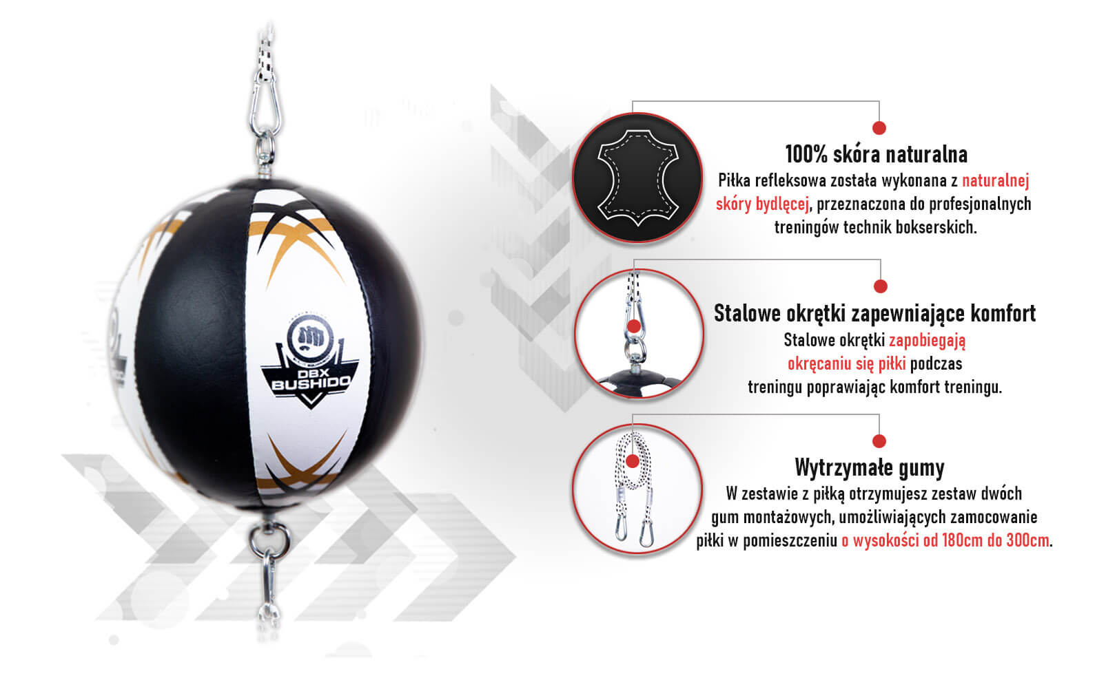 Piłka refleksowa ARS-1164B została wykonana z naturalnej skóry bydlęcej zapewniającej bardzo dużą odporność na rozerwania. Jej obwód wynosi 69 cm co czyni ją średnim rozmiarem wśród wszystkich piłek w naszej ofercie (rozmiar piłki wpływa na trudność treningu).