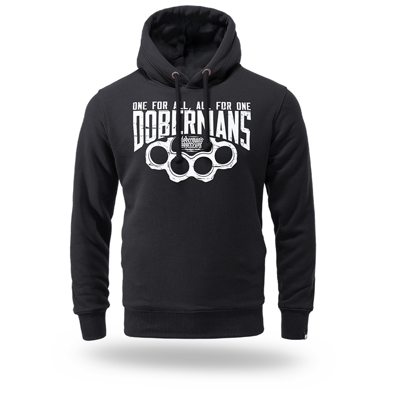 Wygodna bluza wykonana z wysokiej jakości bawełny, zapewniająca komfort noszenia. Dół bluzy oraz rękawy wykończone są szerokim ściągaczem. Na lewym rękawie umieszczona jest mała metka z logo marki. Z przodu bluzy duży napis DOBERMANS z dopiskiem One For All, All For One. Całość wykończona grafiką kastetu oraz logo marki.