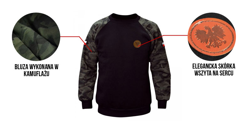 Bluza posiada wszytą skórkę na sercu z wizerunkiem Orła Białego. Na obu rękawach zastosowano motyw anany doskonale w Wosjku Polskim - flagi Polski.
