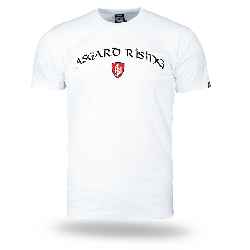 Koszulka męska z krótkim rękawem w klasycznym fasonie. Odzież wykonana z bawełny o gramaturze 200g. Na lewym rękawku mała metka z logo Doberman’s Aggressive. Z przodu koszulki znajduję się napis Asgard Rising z dodatkowym symbolem nordyckim w kształcie tarczy.