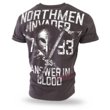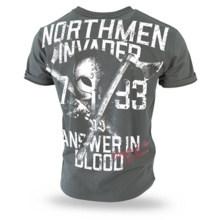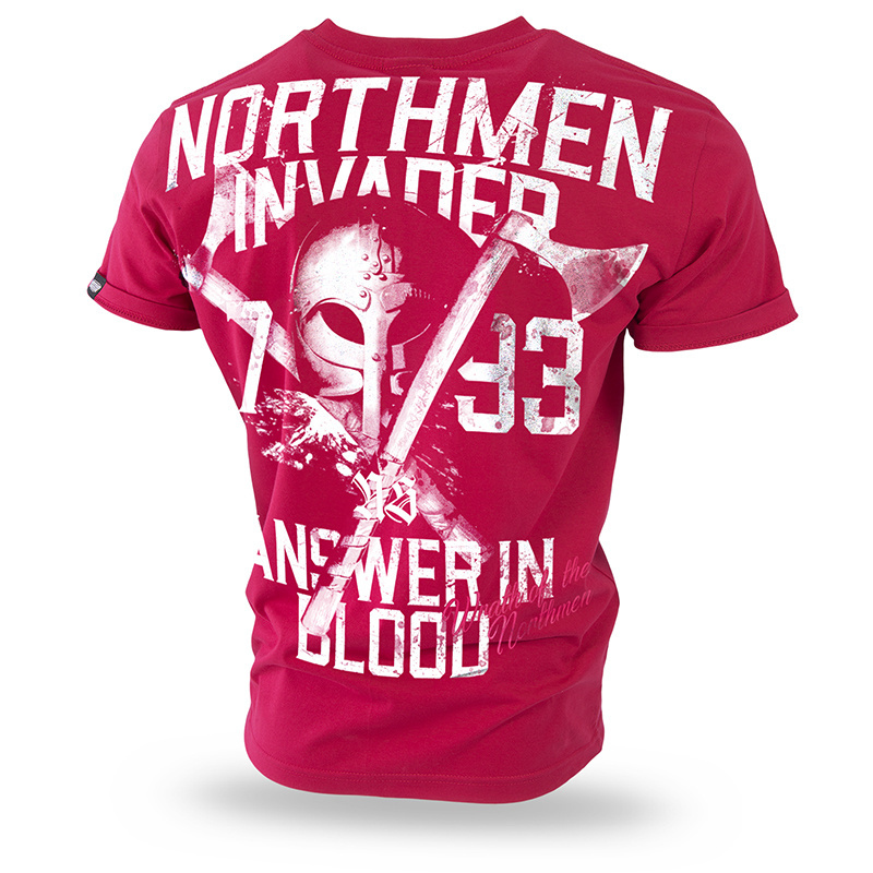 Bawełniany męski T-shirt o klasycznym kroju. Koszulka z krótkim rękawkiem, przy szyi wykończona wąskim ściągaczem. Na lewym rękawie mała metka z logo, wewnątrz wszywka Dobermans Aggressive. Wzdłuż lewego barku wykonano nadruk z napisem symbolami runicznymi. Tył koszulki niemal z w całości pokrywa nadruk. W centrum znajduje się hełm oraz dwa skrzyżowane topory, w tle data 793. Powyżej tekst Northmen Invader. Na wzorze zastosowano efekt podniszczenia.