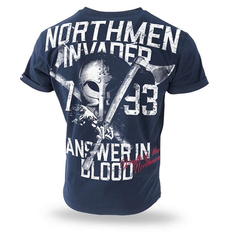 Bawełniany męski T-shirt o klasycznym kroju. Koszulka z krótkim rękawkiem, przy szyi wykończona wąskim ściągaczem. Na lewym rękawie mała metka z logo, wewnątrz wszywka Dobermans Aggressive. Wzdłuż lewego barku wykonano nadruk z napisem symbolami runicznymi. Tył koszulki niemal z w całości pokrywa nadruk. W centrum znajduje się hełm oraz dwa skrzyżowane topory, w tle data 793. Powyżej tekst Northmen Invader. Na wzorze zastosowano efekt podniszczenia.