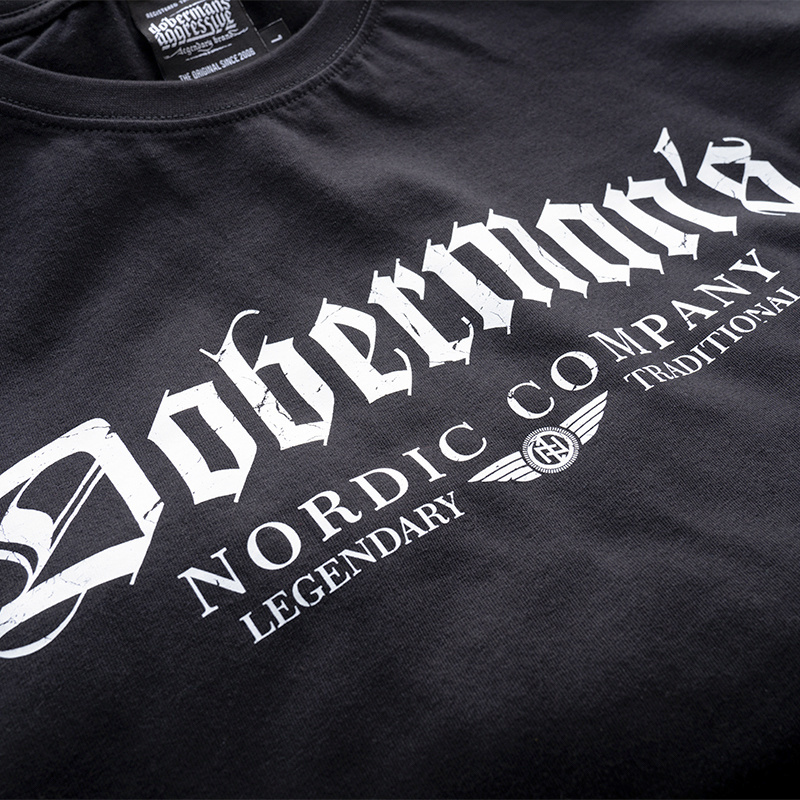 Odzież wykonana z bawełny o gramaturze 200g. Na lewym rękawku mała metka z logo Doberman’s Aggressive. Na przodzie koszulki znajduje się duży napis Dobermans wykonany czcionka gotycka. Wzór uzupełnia dodatkowy tekst poniżej, oraz symbole nordyckie.