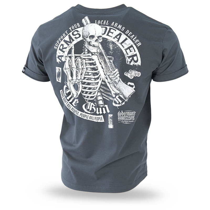 Na lewym rękawie wszyta mała metka z logo marki. Z tyłu koszulki znajduje się duża grafika przedstawiająca szkielet człowieka z bronią oraz napis „Support your local arms dealer” z przodu powielenie grafiki w mniejszym formacie.