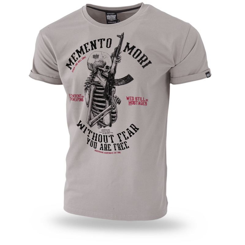 Męska koszulka w standardowym fasonie. Wykonana z wysokiej jakości bawełny. Na lewym rękawie wszyta mała metka z logo marki. Na przodzie znajduje się grafika przedstawiająca szkielet człowieka z bronią wycelowaną ku górze oraz napis MEMENTO MORI WITHOUT FEAR YOU ARE FREE