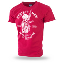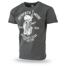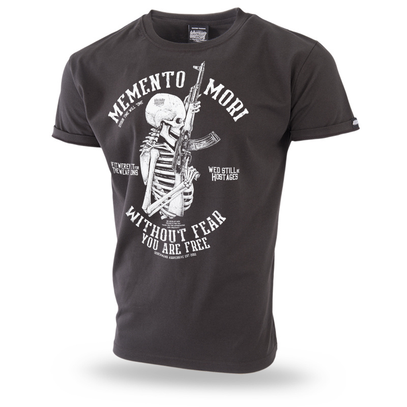 Męska koszulka w standardowym fasonie. Wykonana z wysokiej jakości bawełny. Na lewym rękawie wszyta mała metka z logo marki. Na przodzie znajduje się grafika przedstawiająca szkielet człowieka z bronią wycelowaną ku górze oraz napis MEMENTO MORI WITHOUT FEAR YOU ARE FREE
