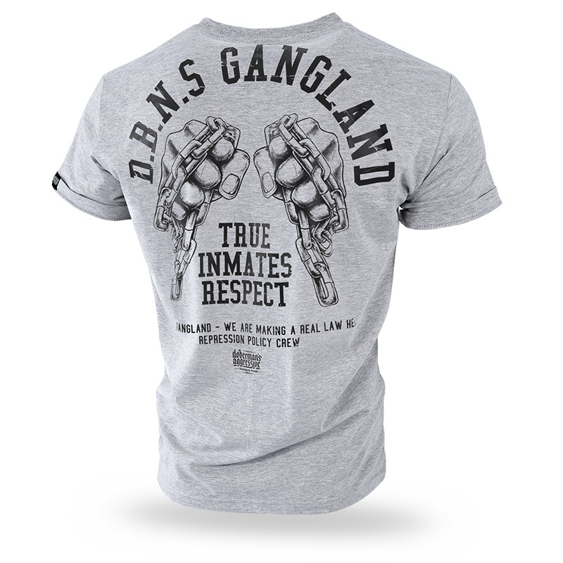 Męska koszulka o klasycznym kroju z krótkim rękawkiem i okrągłym kołnierzem. Wykonana z najwyższej jakości bawełny. Lewy rękawek z naszytą małą metką Doberman’s Aggressive. Model Gangland z charakterystyczną grafiką na plecach, przedstawiającą zaciśnięte do walki pięści z łańcuchami oraz oryginalne napisy typowe dla marki Doberman’s. Przód gładki z miniaturą pięści z inskrypcją na piersi po lewej stronie.
