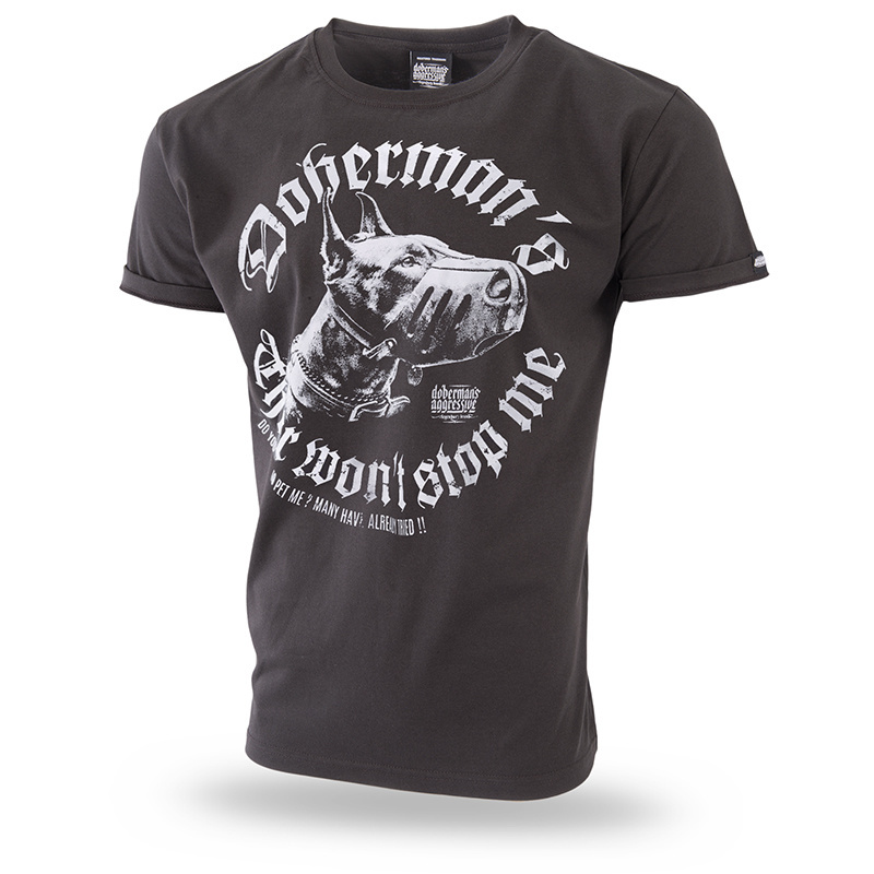 Męska koszulka z nadrukiem w standardowym fasonie. Koszulka wykonana z wysokogatunkowej bawełny o gramaturze 200g. Na lewym rękawku mała metka z logo Dobermans Aggressive. Model z nadrukiem psa w kagańcu i wymownym napisem, wykonanym gotyckimi literami „That won’t stop me”.