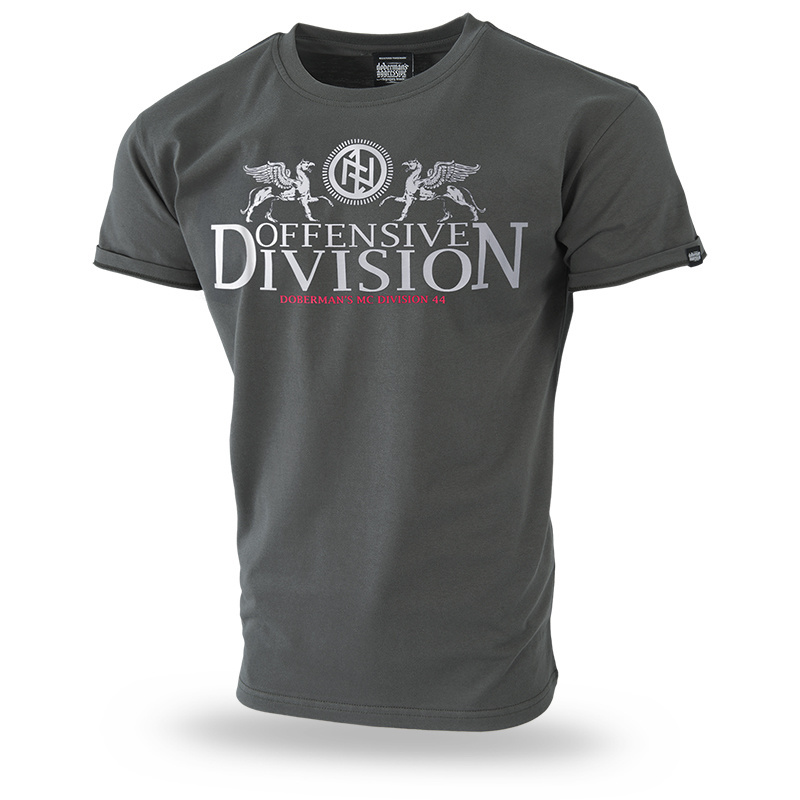 Męska koszulka w standardowym fasonie. Koszulka wykonana z wysokogatunkowej bawełny o gramaturze 200g. Na lewym rękawku mała metka z logo Dobermans Aggressive. Koszulkę zdobi delikatny, ale bardzo charakterystyczny nadruk w postaci napisu DIVISION OFFENSIVE. Nad napisem znajdują się dwa mityczne stworzenia ze skrzydłami. Nordycki znak zamknięty w kole nadaje całości charakteru. Na karku mały nadruk w kształcie koła.