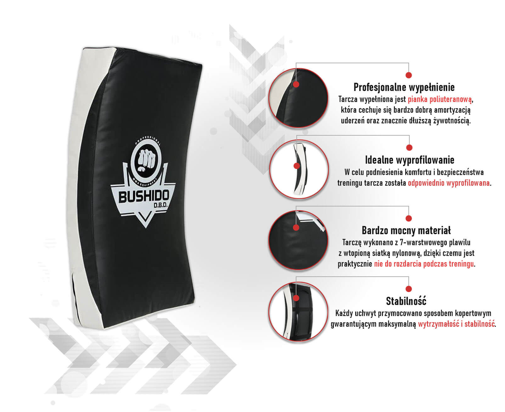 Tarcza dzięki swoim dużym rozmiarom: 62 cm x 35 cm x 12 cm idealnie sprawdza się zarówno podczas treningu kopnięć jak i technik ręcznych. Tarczę wypełniono pianką polieretanową tzw. regeneratem czyli pianką wtórnie spienioną o twardości 90lg/m3. Wypełnienie to zapewnia bardzo dobrą amortyzacją uderzeń, zawsze wraca do pierwotnej postaci i nie kruszy się podczas intensywnych treningów.
