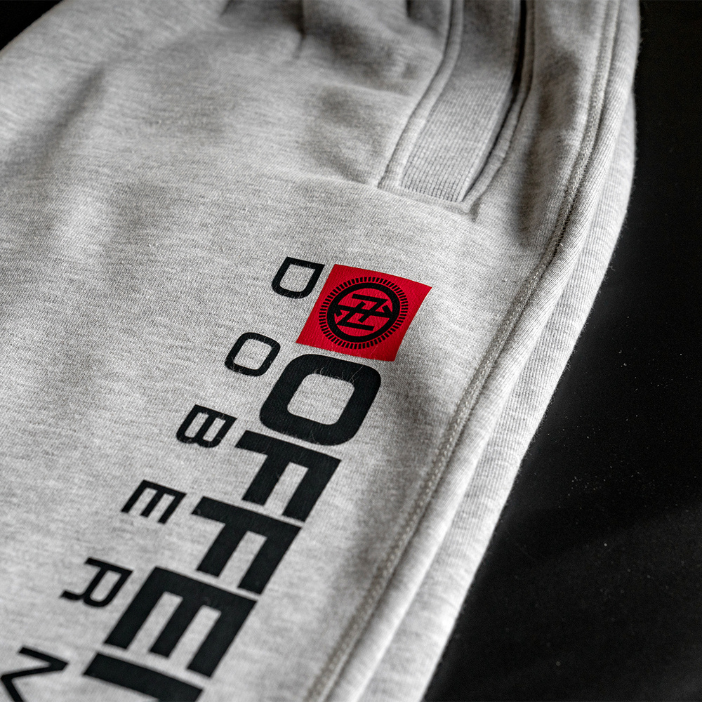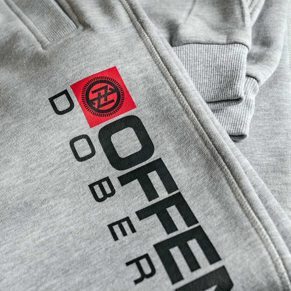 Bawełniane spodnie dresowe z dwiema bocznymi kieszeniami i z prostymi nogawkami. W pasie elastyczny ściągacz i sznurki. Na przodzie lewej nogawki znajduję się prosty napis OFFENSIVE z dopiskiem pod nim DOBERMANS. Całość wzoru uzupełnia symbol nordycki wkomponowany w kształt kwadratu wykonany w czerwonym kolorze.