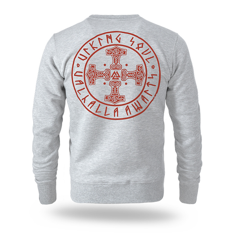 Wysokiej jakości bluza sportowa o prostym kroju, wykonana z grubszego materiału. Model wyróżnia się nadrukiem na plecach z motywem nordyckiego krzyża ozdobionego napisami runicznymi i symbolami wikingów. Napisy to: VIKING SOUL – VALHALLA AWAITS. Z przodu, na piersi, umieszczono mniejszy nadruk nawiązujący do głównego motywu.