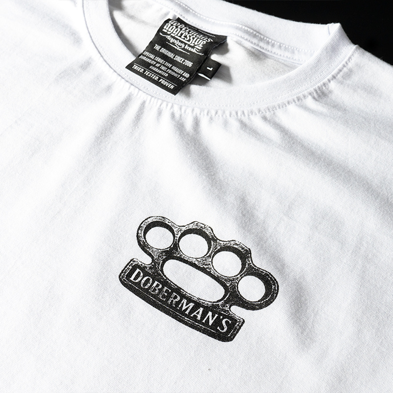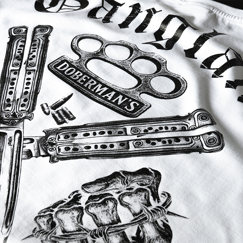 Wykonana z wysokiej jakości materiału, zapewniającego komfort i trwałość. Na plecach znajduje się odważny nadruk z grafiką kastetów, noży motylkowych, zaciśniętych pięści i postaci w kominiarce. Poniżej widnieją hasła: Loyalty. Brotherhood. One crew. oraz One for all, all for one. Z przodu, na piersi, umieszczono mniejszy nadruk z kastetem i napisem Doberman's.