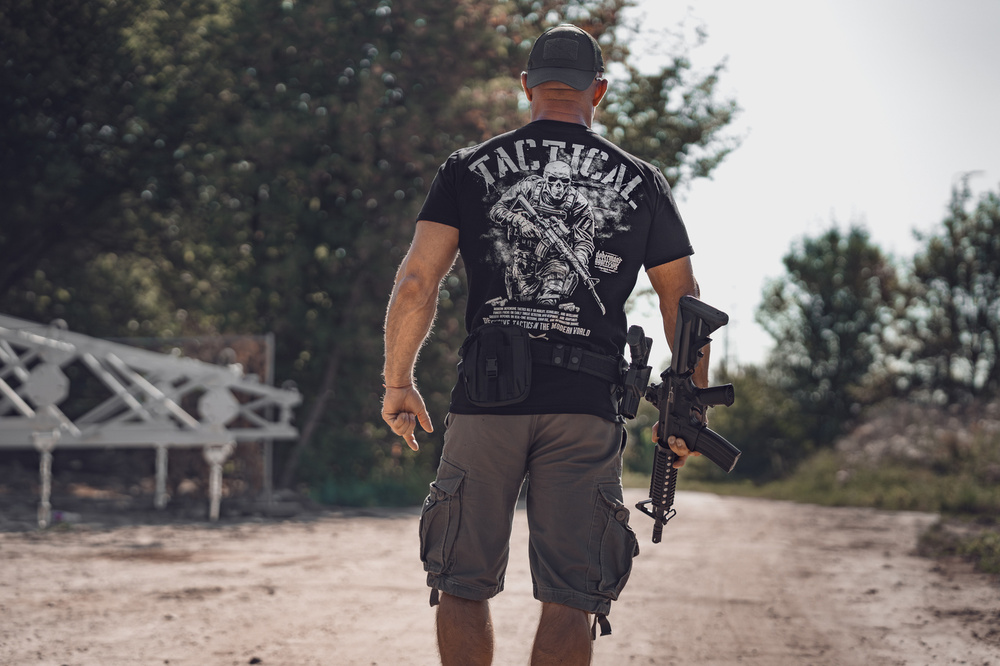 Z tyłu znajduje się dynamiczny nadruk przedstawiający szkielet z karabinem w kompozycji bojowej z hasłem „TACTICAL”. Poniżej umieszczono napis „Defensive tactics in the modern world” oraz dodatkowy tekst w języku angielskim. Z przodu widoczny jest mniejszy motyw graficzny z dwoma skrzyżowanymi nożami.