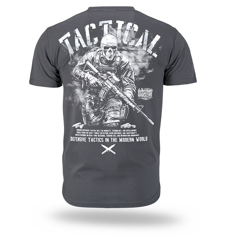 Z tyłu znajduje się dynamiczny nadruk przedstawiający szkielet z karabinem w kompozycji bojowej z hasłem „TACTICAL”. Poniżej umieszczono napis „Defensive tactics in the modern world” oraz dodatkowy tekst w języku angielskim. Z przodu widoczny jest mniejszy motyw graficzny z dwoma skrzyżowanymi nożami.