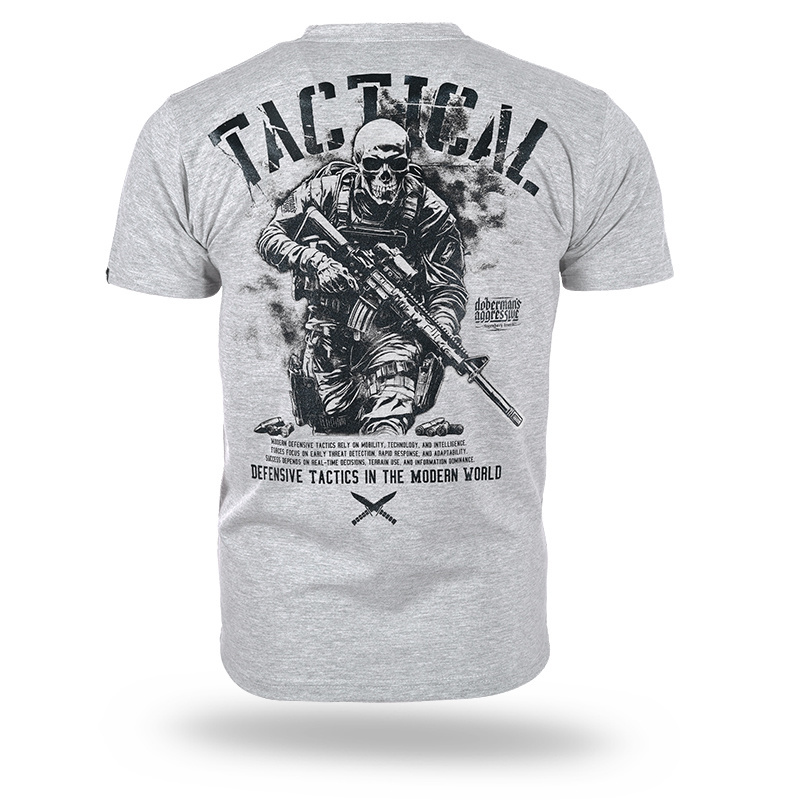 Z tyłu znajduje się dynamiczny nadruk przedstawiający szkielet z karabinem w kompozycji bojowej z hasłem „TACTICAL”. Poniżej umieszczono napis „Defensive tactics in the modern world” oraz dodatkowy tekst w języku angielskim. Z przodu widoczny jest mniejszy motyw graficzny z dwoma skrzyżowanymi nożami.