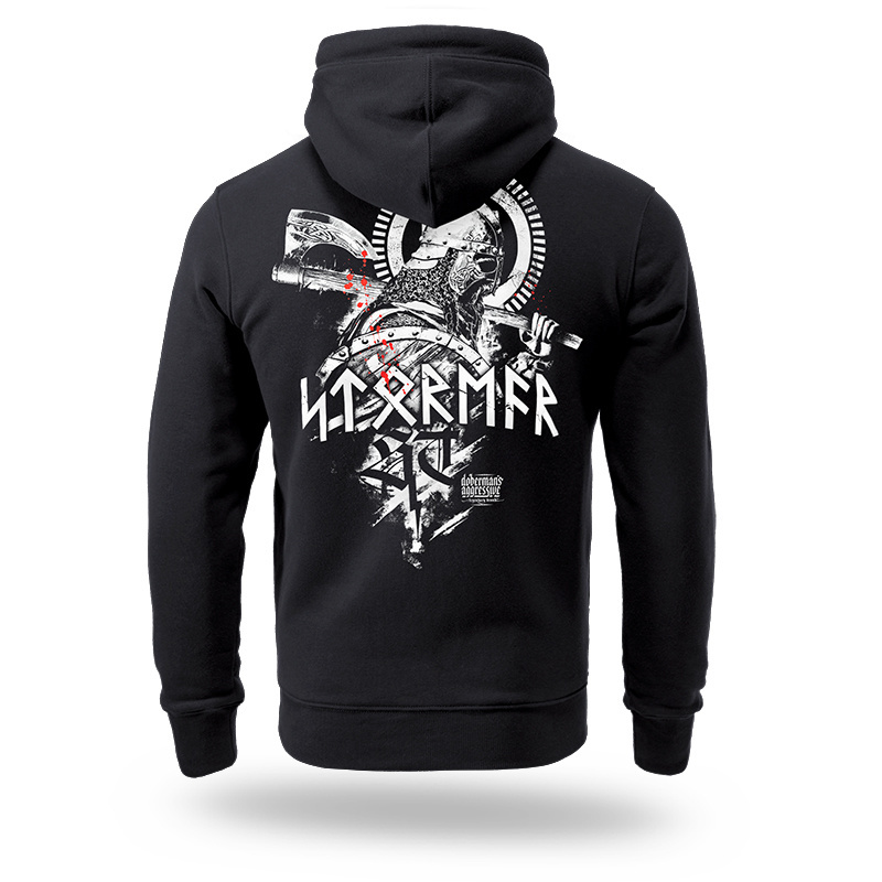 Model wyróżnia się efektownym nadrukiem na plecach przedstawiającym nordyckiego wojownika w hełmie, z tarczą i toporem w dłoniach. Projekt uzupełnia duży napis „STORMER” stylizowany na runiczny alfabet, który widnieje również z przodu na piersi.
