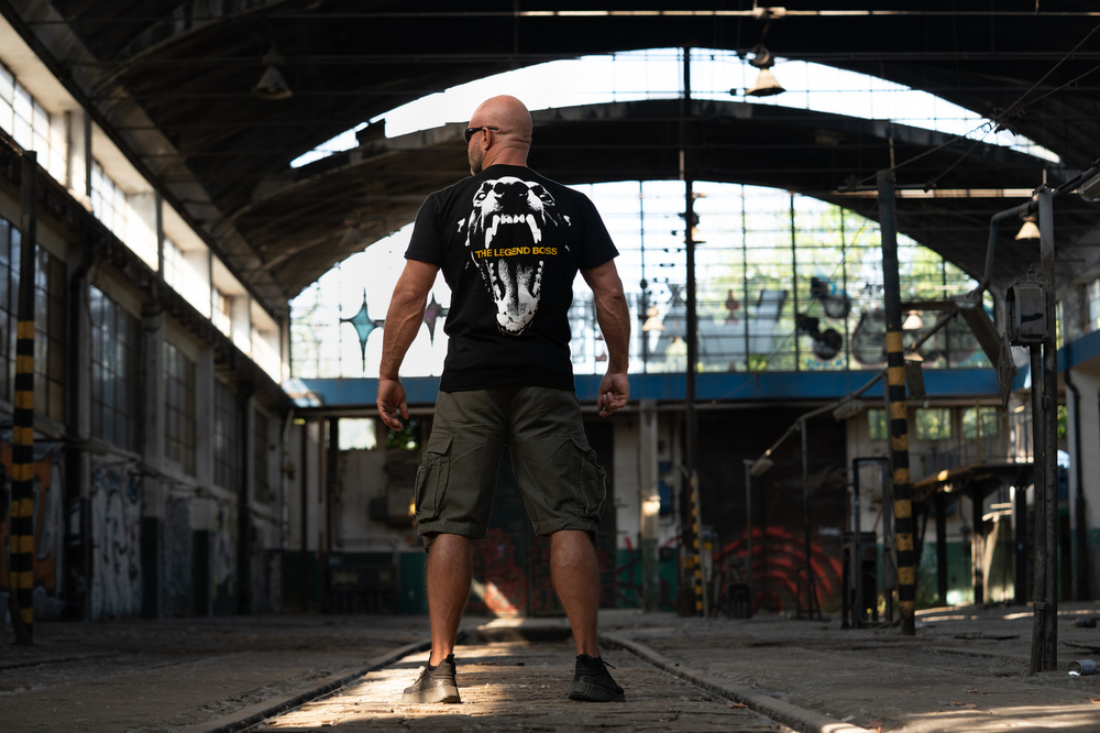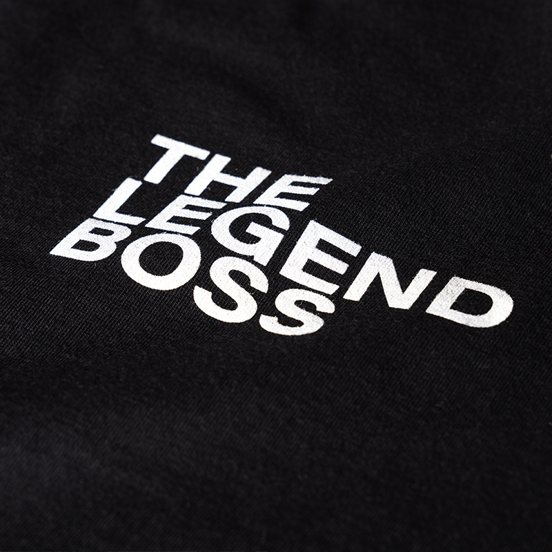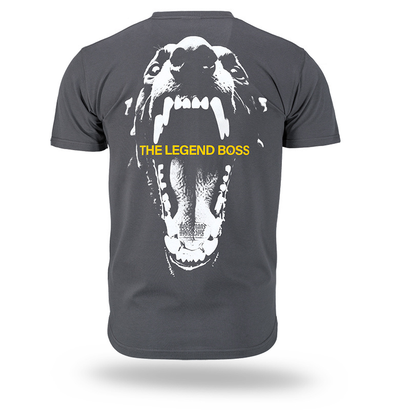 Na piersi umieszczony mały napis „THE LEGEND BOSS”, a tył zdobi duża grafika z otwartą paszczą psa oraz napisem „THE LEGEND BOSS” w kontrastującym kolorze. Produkt wykonany z wysokiej jakości bawełny, zapewniającej komfort noszenia.