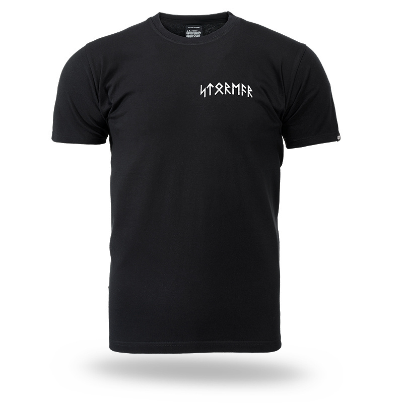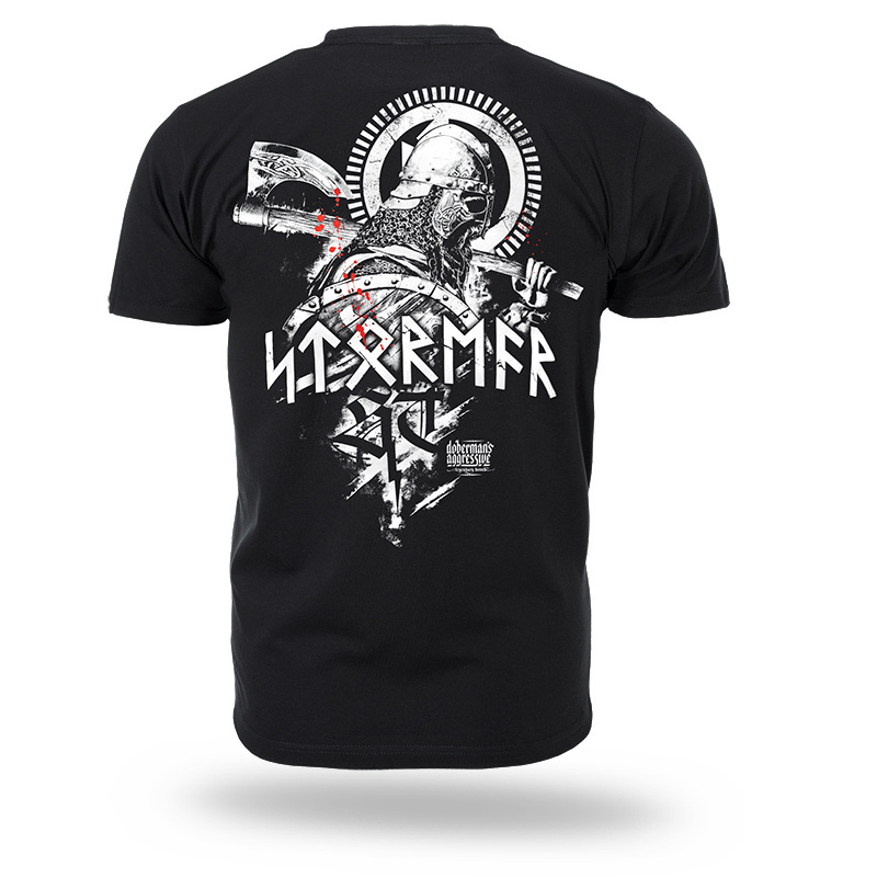 Model wyróżnia się efektownym nadrukiem na plecach przedstawiającym nordyckiego wojownika w hełmie, z tarczą i toporem w dłoniach. Projekt uzupełnia duży napis „STORMER” stylizowany na runiczny alfabet, który widnieje również z przodu na piersi.