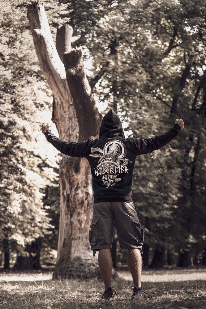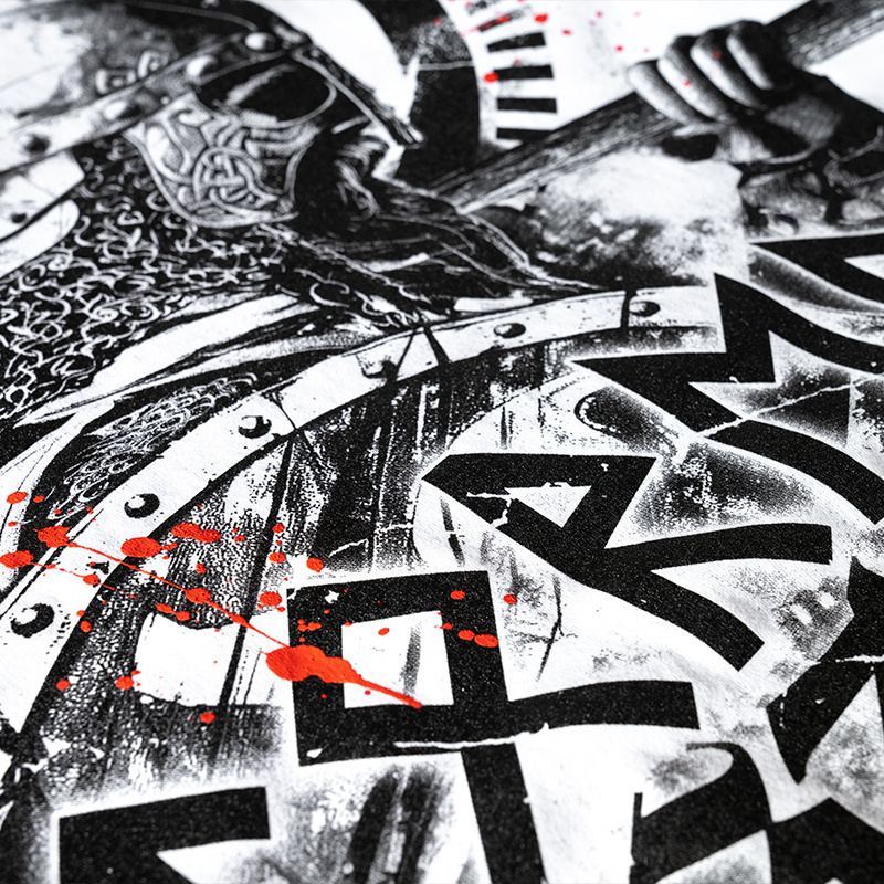 Model wyróżnia się efektownym nadrukiem na plecach przedstawiającym nordyckiego wojownika w hełmie, z tarczą i toporem w dłoniach. Projekt uzupełnia duży napis „STORMER” stylizowany na runiczny alfabet, który widnieje również z przodu na piersi.