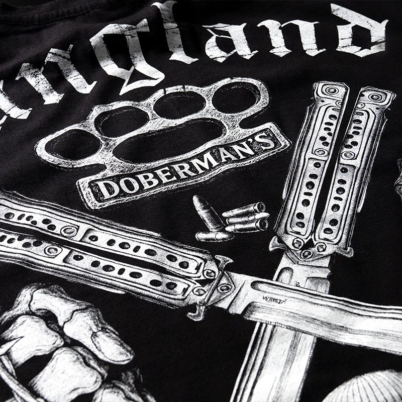 Wykonany z wysokogatunkowej bawełny, zapewnia komfort noszenia i trwałość nadruku. Na plecach znajduje się odważny nadruk z grafiką kastetów, noży motylkowych, zaciśniętych pięści i postaci w kominiarce. Poniżej widnieją hasła: Loyalty. Brotherhood. One crew. oraz One for all, all for one. Z przodu, na piersi, umieszczono mniejszy nadruk z kastetem i napisem Doberman's.