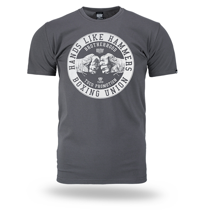 Wykonany z wysokogatunkowej bawełny, zapewnia komfort noszenia i trwałość nadruku. Z przodu koszulki umieszczono okrągłą grafikę z motywem pięści i napisami nawiązującymi do braterstwa i sportów walki. Centralnym elementem projektu jest hasło "HANDS LIKE HAMMERS", które podkreśla siłę i charakter. Koszulka wykonana z wysokiej jakości bawełny, zapewniającej komfort noszenia i trwałość nadruku.