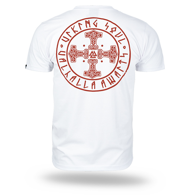 Wykonany z wysokogatunkowej bawełny, zapewnia komfort noszenia i trwałość nadruku. Model wyróżnia się nadrukiem na plecach z motywem nordyckiego krzyża ozdobionego napisami runicznymi i symbolami wikingów. Napisy to: VIKING SOUL – VALHALLA AWAITS. Z przodu, na piersi, umieszczono mniejszy nadruk nawiązujący do głównego motywu.