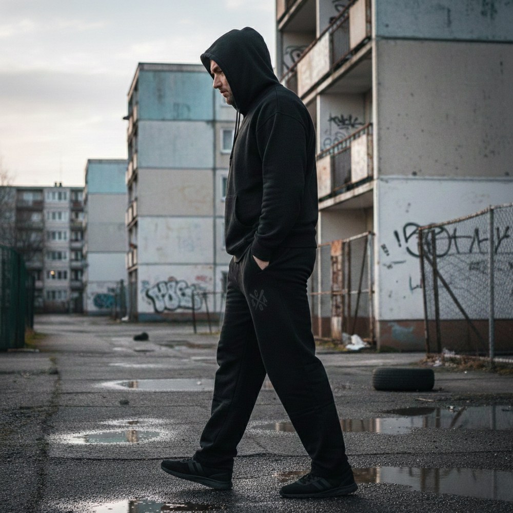 Klasyczne spodnie dresowe marki Extreme Adrenaline o prostym, luźnym kroju, który zapewnia pełną swobodę ruchów i wygodę podczas codziennego użytkowania. Wykonane z czarnej, solidnej dzianiny, posiadają elastyczny pas dodatkowo regulowany sznurkiem, co pozwala na idealne dopasowanie do sylwetki. Model wyposażono w praktyczne, wpuszczane kieszenie boczne. Poniżej lewej kieszeni znajduję się czarny nadruk w postaci dwóch skrzyżowanych ze sobą kijów bejsbolowych otoczonych napisem ACAB. Brak ściągaczy na dole nogawek nadaje im tradycyjny, swobodny wygląd.