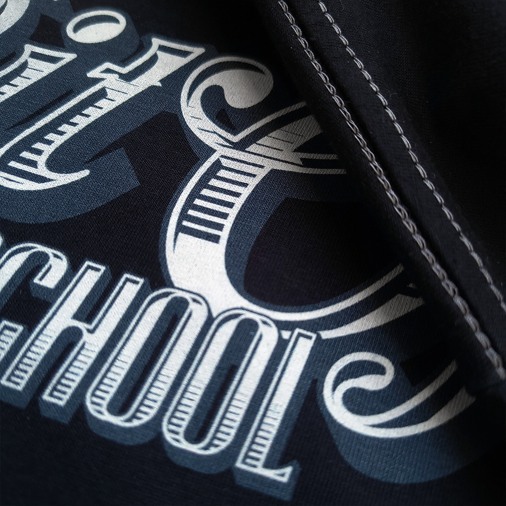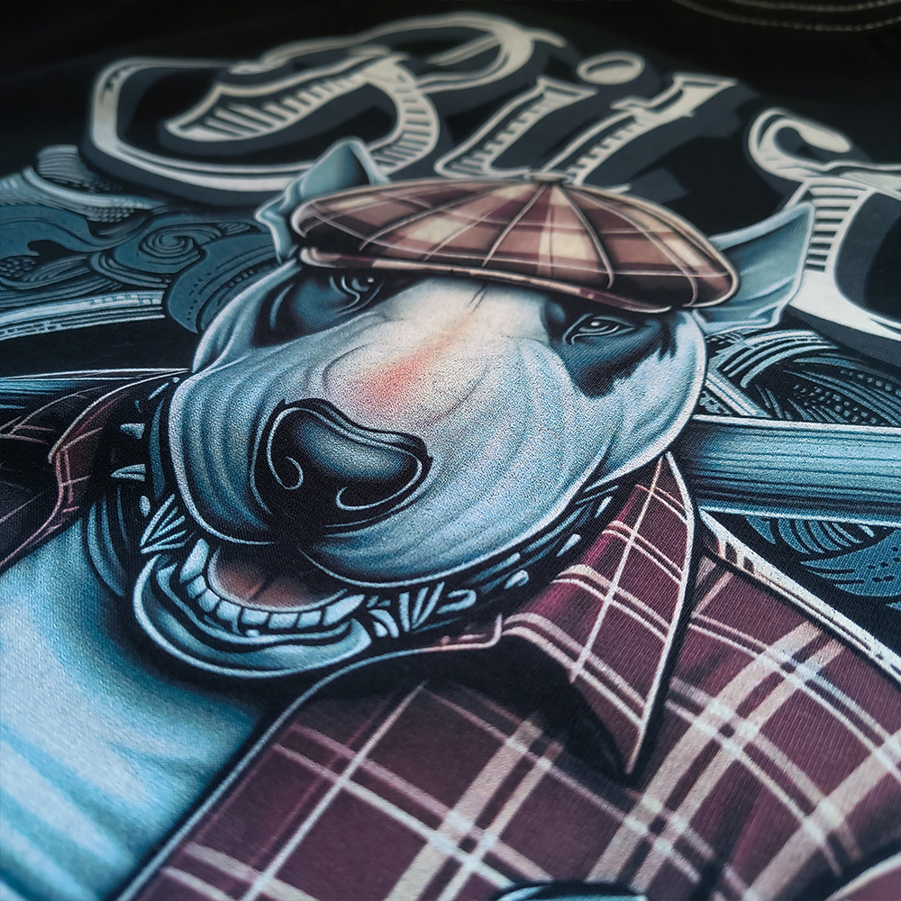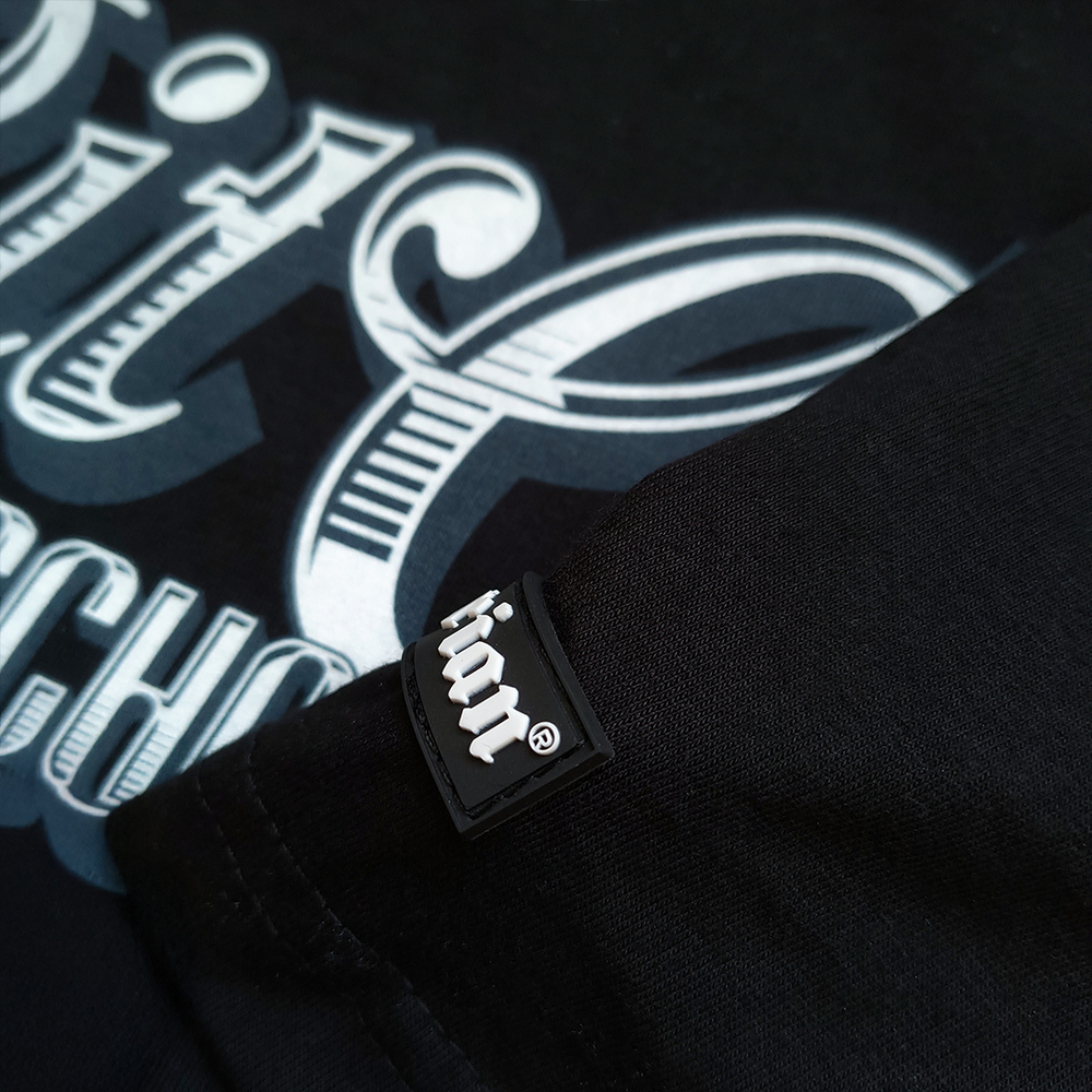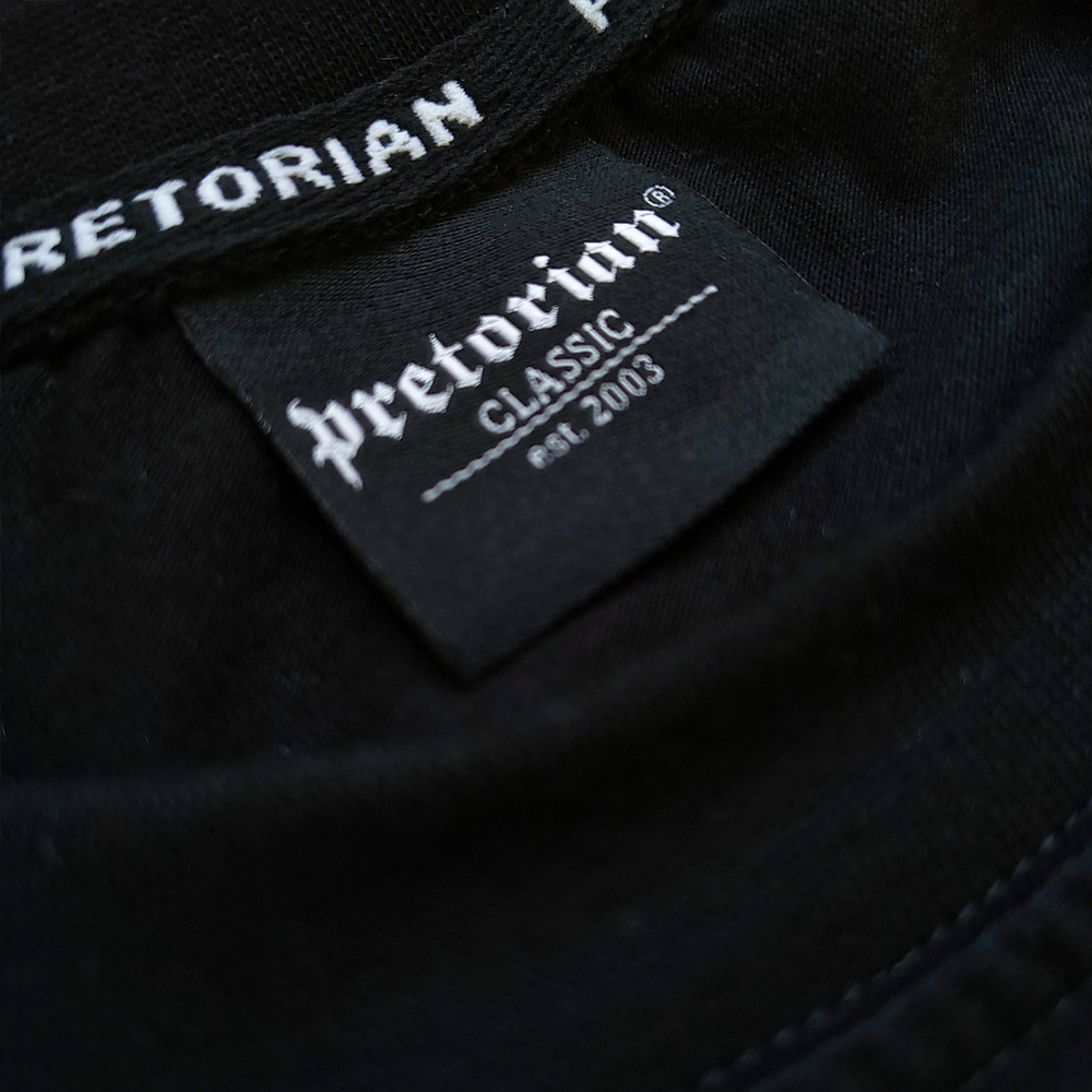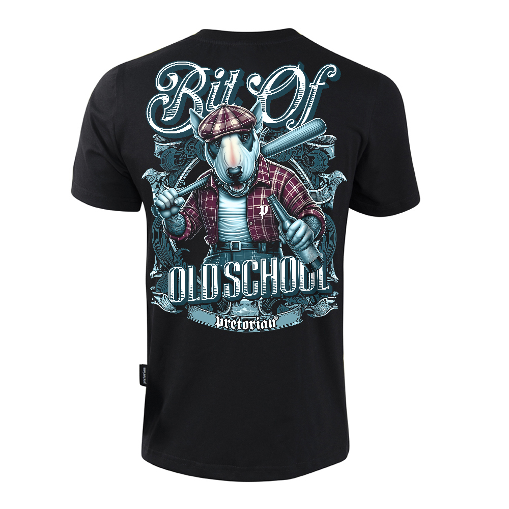 Czarna koszulka marki Pretorian to klasyczny t-shirt o sportowym kroju, ozdobiony stylowym napisem „Bit of Old School” na piersi. Prawdziwy charakter nadaje jej jednak efektowna grafika na plecach, przedstawiająca bulteriera w kaszkiecie z kijem bejsbolowym, utrzymana w klimacie ulicznego retro. Całość dopełniają staranne detale, takie jak żakardowe naszywki oraz ozdobna lamówka wewnątrz karku. Produkt w pełni wyprodukowany w Polsce.