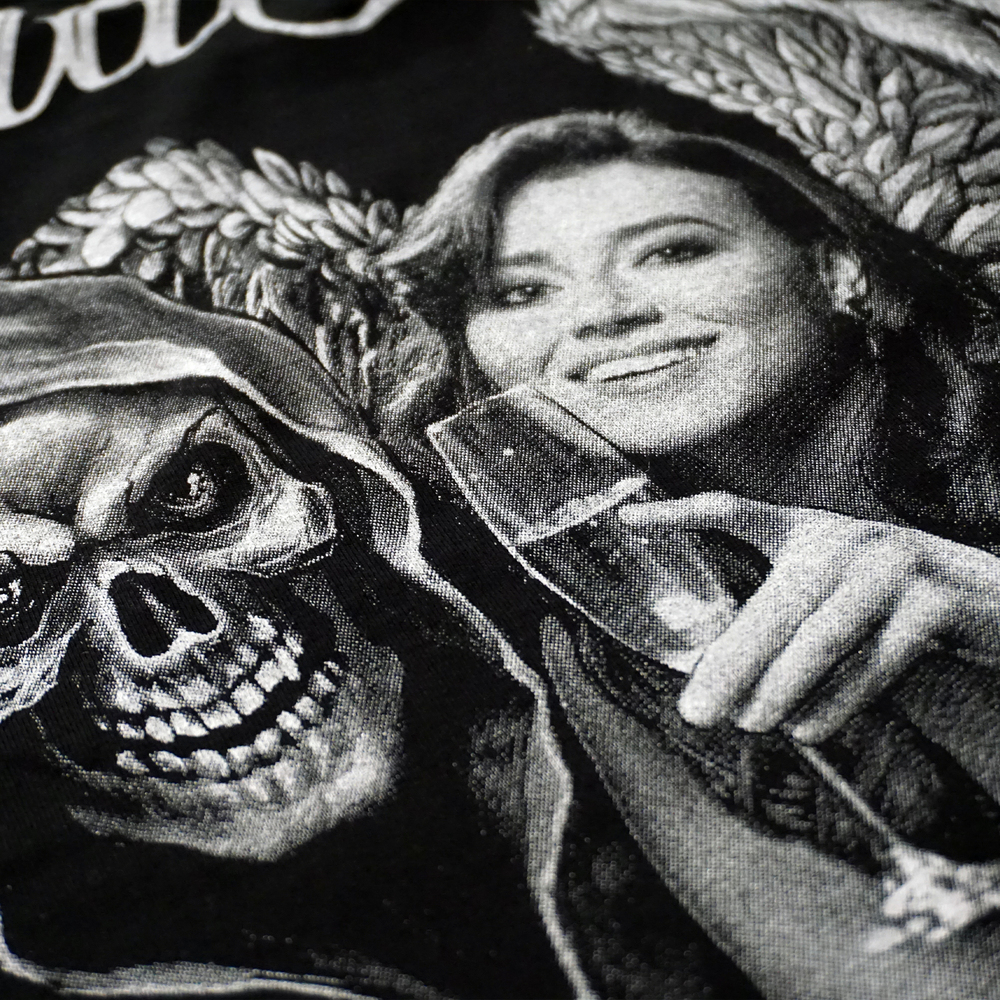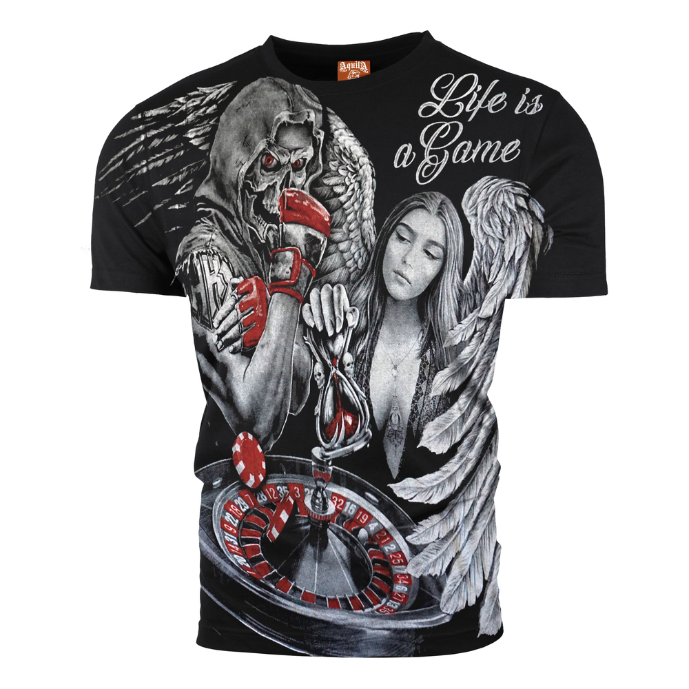Czarna koszulka męska "Life is a Game" marki Aquila charakteryzuje się bogatym, mrocznym wzornictwem utrzymanym w stylistyce tatuażowej. Głównym motywem graficznym jest starcie sił nadprzyrodzonych. Na przodzie widnieje postać w czerwonych rękawicach bokserskich oraz anioł trzymający klepsydrę, co dopełnia stylizowany napis „Life is a Game” oraz grafika koła ruletki. Tył koszulki kontynuuje tę historię, pokazując te same postacie w bardziej triumfalnej pozie, zwieńczonej dużym napisem „Hard Knox” na łopatkach. Całość projektu opiera się na kontrastowej, czarno-białej grafice z wyraźnymi, czerwonymi akcentami, które przyciągają wzrok. T-shirt posiada klasyczny krój z okrągłym dekoltem, co czyni go wyrazistym elementem codziennej, streetwearowej stylizacji.