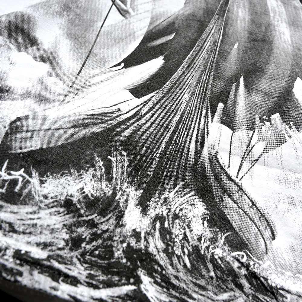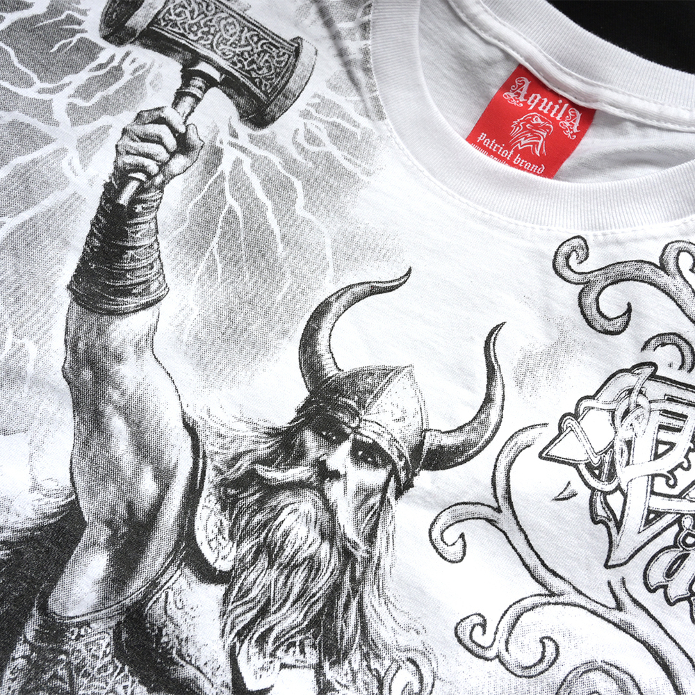 Biała męska koszulka marki Aquila to wyrazista propozycja dla miłośników mitologii nordyckiej, utrzymana w stylistyce szczegółowego szkicu. Na froncie znajduje się dynamiczna postać potężnego wikinga w rogatym hełmie, który w uniesionej dłoni dzierży zdobiony młot na tle uderzających piorunów. Kompozycję przodu dopełnia stylizowane drzewo o krętych gałęziach oraz ozdobny napis „Valhalla” umieszczony na wysokości piersi. Tył koszulki zdobi rozbudowana grafika przedstawiająca drakkar płynący przez wzburzone fale, nad którym góruje Yggdrasil – mityczne drzewo życia – wpisane w okrąg z tradycyjnym splotem celtyckim. Całość nadruku wykonana jest w eleganckiej, czarno-szarej kolorystyce, która na białym tle materiału zyskuje wyjątkową głębię i surowy charakter.