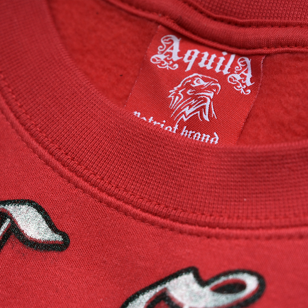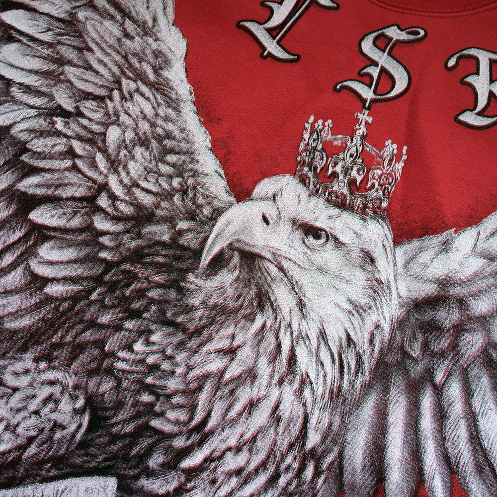 Czerwona bluza męska "Tysiące serc, jedno bicie" marki Aquila to wyrazisty projekt patriotyczny, który łączy bogatą symbolikę narodową z klasyczną estetyką. Z przodu bluzy znajduję się szczegółowa grafika przedstawiająca orła w koronie, który w szponach dzierży miecz z polskim herbem na jelcu. Całość kompozycji dopełnia biały, stylizowany napis „POLSKA” u góry oraz łacińska sentencja „Amor Patriae Nostra Lex” (Miłość ojczyzny naszym prawem). Tył bluzy zdobi rozbudowany, dwugłowy orzeł trzymający w szponach krzyż oraz miecz, z tarczą herbową na piersi. Nad grafiką widnieje białe hasło „Tysiące serc, jedno bicie”, natomiast dół pleców zamyka napis „Polska ponad życie”. Intensywny, czerwony kolor materiału stanowi idealne tło dla czarno-białych nadruków z czerwonymi akcentami, tworząc spójną i pełną dumy całość. Bluza posiada klasyczny fason ze ściągaczami przy rękawach i na dole.
