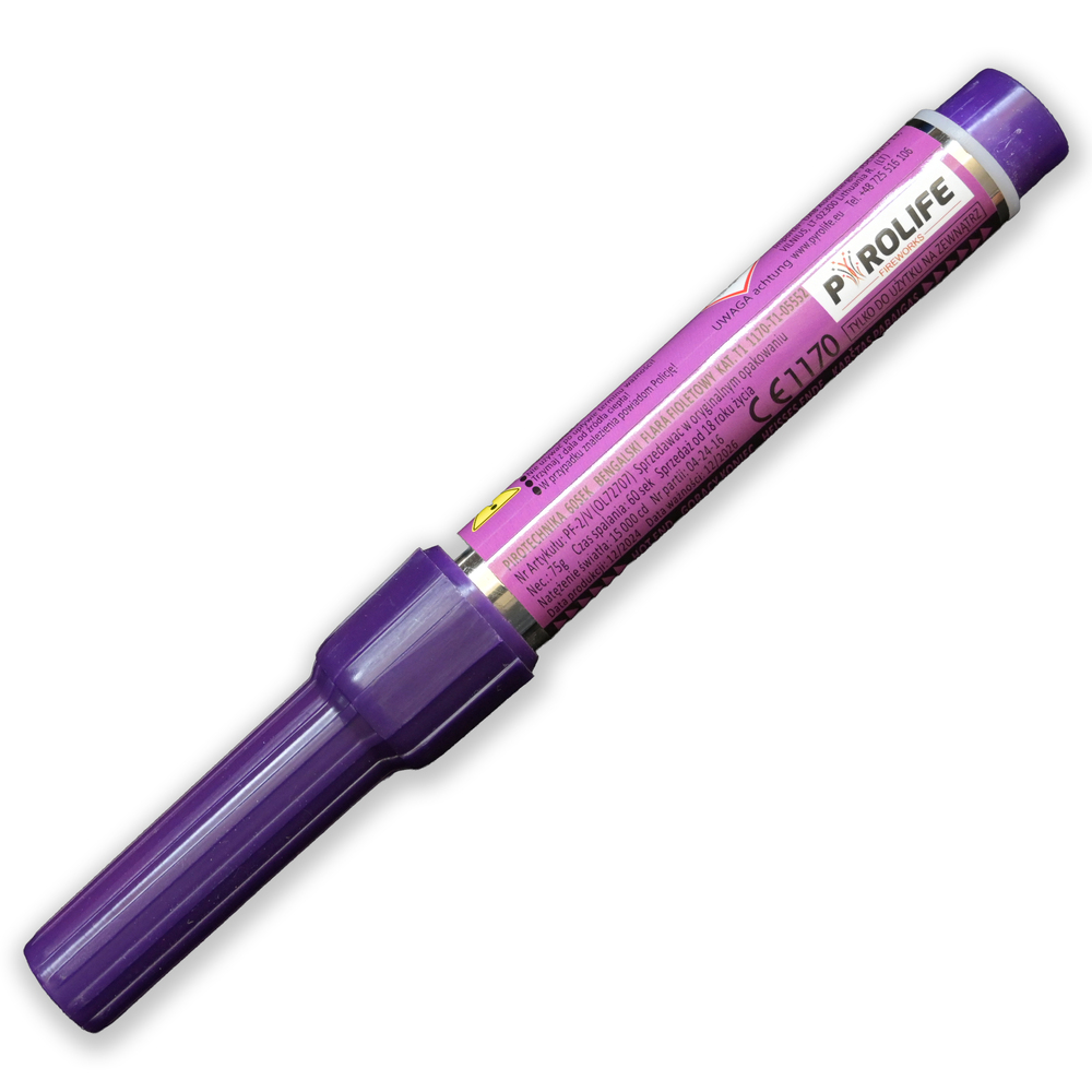 Profesjonalna flara bengalska o intensywnym, fioletowym świetle. Produkt charakteryzuje się wysoką jakością wykonania oraz gęstym, soczystym kolorem płomienia, który jest widoczny nawet w trudnych warunkach atmosferycznych.