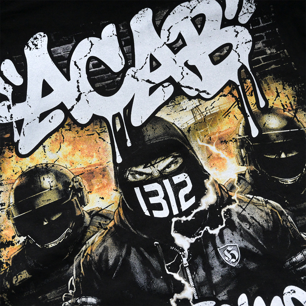 Czarna męska koszulka marki Extreme Adrenaline to projekt mocno osadzony w estetyce ulicznej i graffiti, niosący bezkompromisowy przekaz. Na froncie znajduje się biały, stylizowany napis „Extreme Adrenaline” wykonany w technice „drippingu”, imitujący świeżo rozpyloną farbę z charakterystycznymi zaciekami. Tył koszulki - na tle ceglanego muru widnieją trzy postacie – centralna postać w kapturze z zasłoniętą twarzą czarną chustą, na której widnieje numer „1312”, oraz dwie asystujące postacie w kaskach. Górną część pleców zajmuje duży, agresywny napis „ACAB” w stylu graffiti, natomiast dół zamyka powtórzony napis „Extreme Adrenaline”. Całość nadruku utrzymana jest w kontrastowej, czarno-białej kolorystyce z żółtymi akcentami świetlnymi, co nadaje projektowi mroczny, miejski charakter.