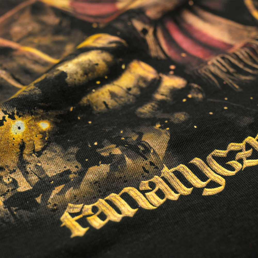 Czarna męska koszulka marki Extreme Adrenaline to mroczny i niezwykle dynamiczny projekt, który czerpie inspirację z kultury stadionowej i motywu delikatnej grozy. Na froncie znajduje się stylizowany, dwukolorowy napis „No pyro No party”, pod którym umieszczono mniejszą nazwę marki. Na plecach grafika przedstawiająca demoniczną postać klauna w pasiastym szaliku, który z obłąkańczym uśmiechem trzyma płonącą racę. Tło wypełniają kłęby dymu i ognia, co w połączeniu z dużym, żółtym napisem u góry tworzy niezwykle intensywną kompozycję. Całość wieńczy hasło „fanatyczny styl życia”, umieszczone na samym dole pleców.