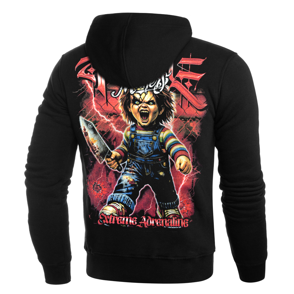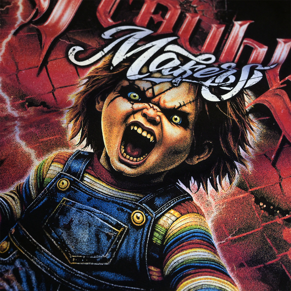 Model ten to mroczny i agresywny projekt nawiązujący do klasyki kina grozy oraz kultury ulicznej. Na froncie znajduje się stylizowany, wielowarstwowy napis „Trouble Makers”, wykonany w kolorystyce czerwono-białej z efektem zacieków, który nadaje całości buntowniczego charakteru. Plecy zdobi rozbudowana, niezwykle szczegółowa grafika przedstawiająca demoniczną laleczkę umieszczoną na tle ogrodzenia z siatki i uderzających piorunów. Nad postacią powtórzono duży napis „Trouble Makers”, a dolną część pleców zamyka gotycka czcionka z nazwą producenta. Intensywne, czerwone akcenty grafiki mocno kontrastują z głęboką czernią materiału, tworząc wyrazistą kompozycję o silnym oddziaływaniu wizualnym.
