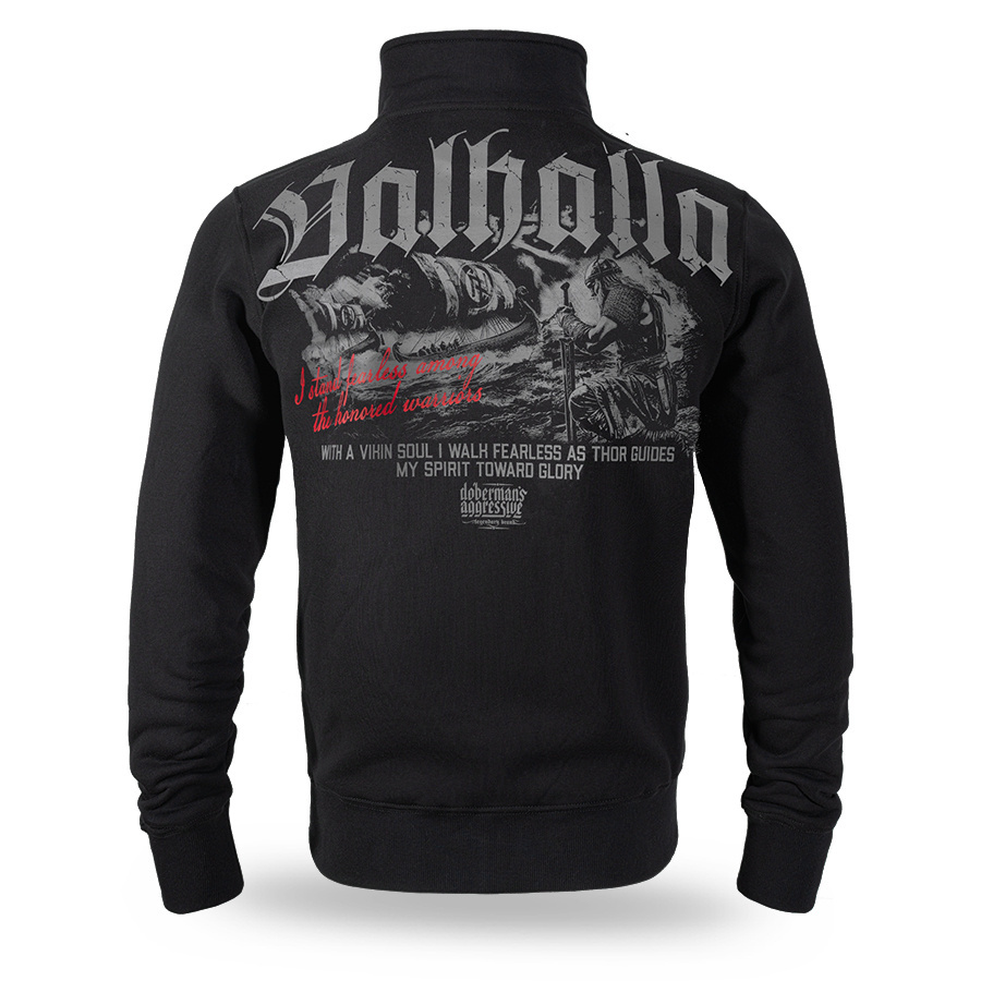Męska bluza rozpinana Dobermans Aggressive z wysokogatunkowej dzianiny, która gwarantuje maksymalną wygodę oraz ponadprzeciętną trwałość podczas codziennego użytkowania. Konstrukcję oparto na niezawodnym zamku błyskawicznym na całej długości, co czyni z niej niezwykle praktyczną i uniwersalną odzież uliczną. Przód projektu zachowuje streetwearowy minimalizm – na lewej piersi widnieje jedynie subtelne logo „Valhalla” opatrzone dyskretnym symbolem graficznym. Prawdziwą siłę eksponuje jednak tył odzieży, gdzie umieszczono wielkoformatowy, efektowny nadruk głęboko zakorzeniony w nordyckiej mitologii. Centralnym punktem tej wyrazistej grafiki jest potężny motyw wojownika, dopełniony charakterystyczną typografią „Valhalla”. Całość spinają klimatyczne hasła nawiązujące do honoru, odwagi i walki. To idealny wybór dla mężczyzn, którzy pragną podkreślić swój surowy, wojowniczy styl i zdecydowany charakter.