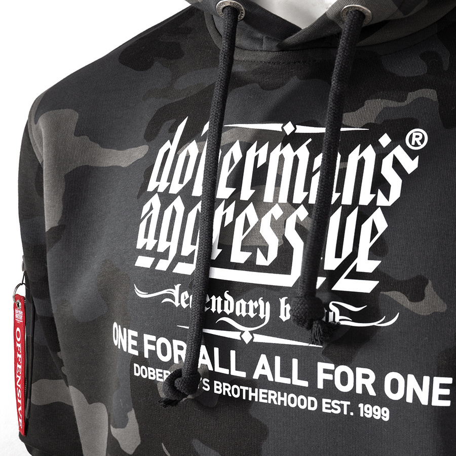 Męska bluza z kapturem Dobermans Aggressive łącząca maksymalną wygodę z surowym, ulicznym stylem. Model został wyposażony w regulowany kaptur ze sznurkami oraz dużą, praktyczną kieszeń typu kangur umieszczoną z przodu. Na rękawie znajduje się dodatkowa kieszeń zapinana na zamek, którą ozdobiono charakterystyczną zawieszką. Dół oraz mankiety wykończono elastycznym ściągaczem, co zapewnia lepsze dopasowanie do sylwetki i komfort noszenia w każdej sytuacji. Zdecydowany charakter bluzy podkreśla umieszczony na froncie wyrazisty nadruk z logotypem „Doberman’s Aggressive – legendary brand”. Całość uzupełnia mocne hasło „One for all, all for one – Doberman’s Brotherhood est. 1999”, które idealnie oddaje tożsamość, braterstwo i bezkompromisowy przekaz marki. To doskonały wybór dla mężczyzn ceniących niezawodną funkcjonalność i mocny, rozpoznawalny design.