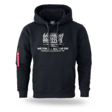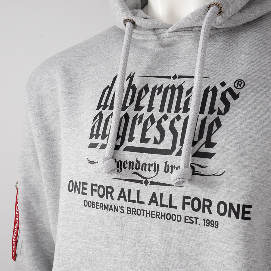 Męska bluza z kapturem Dobermans Aggressive łącząca maksymalną wygodę z surowym, ulicznym stylem. Model został wyposażony w regulowany kaptur ze sznurkami oraz dużą, praktyczną kieszeń typu kangur umieszczoną z przodu. Na rękawie znajduje się dodatkowa kieszeń zapinana na zamek, którą ozdobiono charakterystyczną zawieszką. Dół oraz mankiety wykończono elastycznym ściągaczem, co zapewnia lepsze dopasowanie do sylwetki i komfort noszenia w każdej sytuacji. Zdecydowany charakter bluzy podkreśla umieszczony na froncie wyrazisty nadruk z logotypem „Doberman’s Aggressive – legendary brand”. Całość uzupełnia mocne hasło „One for all, all for one – Doberman’s Brotherhood est. 1999”, które idealnie oddaje tożsamość, braterstwo i bezkompromisowy przekaz marki. To doskonały wybór dla mężczyzn ceniących niezawodną funkcjonalność i mocny, rozpoznawalny design.