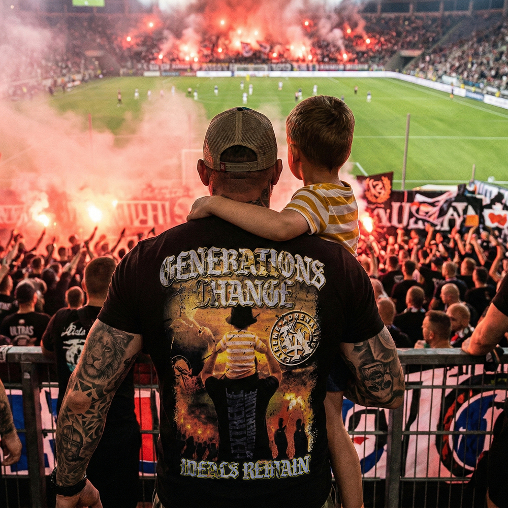 Głównym elementem modelu jest niezwykle klimatyczna, wielokolorowa grafika na plecach, która przedstawia dorosłego kibica niosącego dziecko na ramionach. Scena ta rozgrywa się na tle trybun rozświetlonych blaskiem rac, co nadaje całości nostalgicznego i emocjonalnego charakteru. Projekt dopełniają wymowne hasła: „GENERATIONS CHANGE” u góry oraz „IDEALS REMAIN” na dole, wykonane tą samą, charakterystyczną czcionką.
