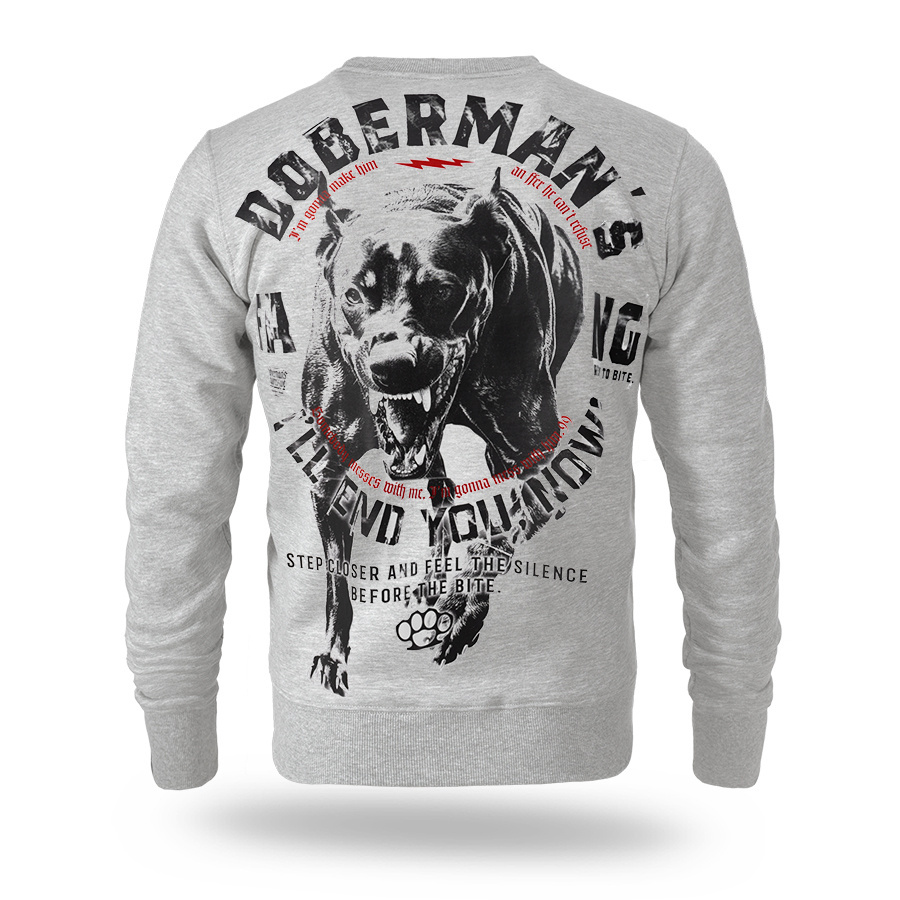 Głównym atutem projektu jest potężna, dynamiczna grafika na plecach, przedstawiająca agresywnego dobermana w ofensywnej pozie, otoczonego wyrazistymi hasłami. Na piersi umieszczono dyskretniejszy nadruk z nazwą marki oraz motywem kastetu, który idealnie dopełnia surowy, miejski design. To propozycja dla osób szukających odzieży o zdecydowanym charakterze i drapieżnym wyglądzie.