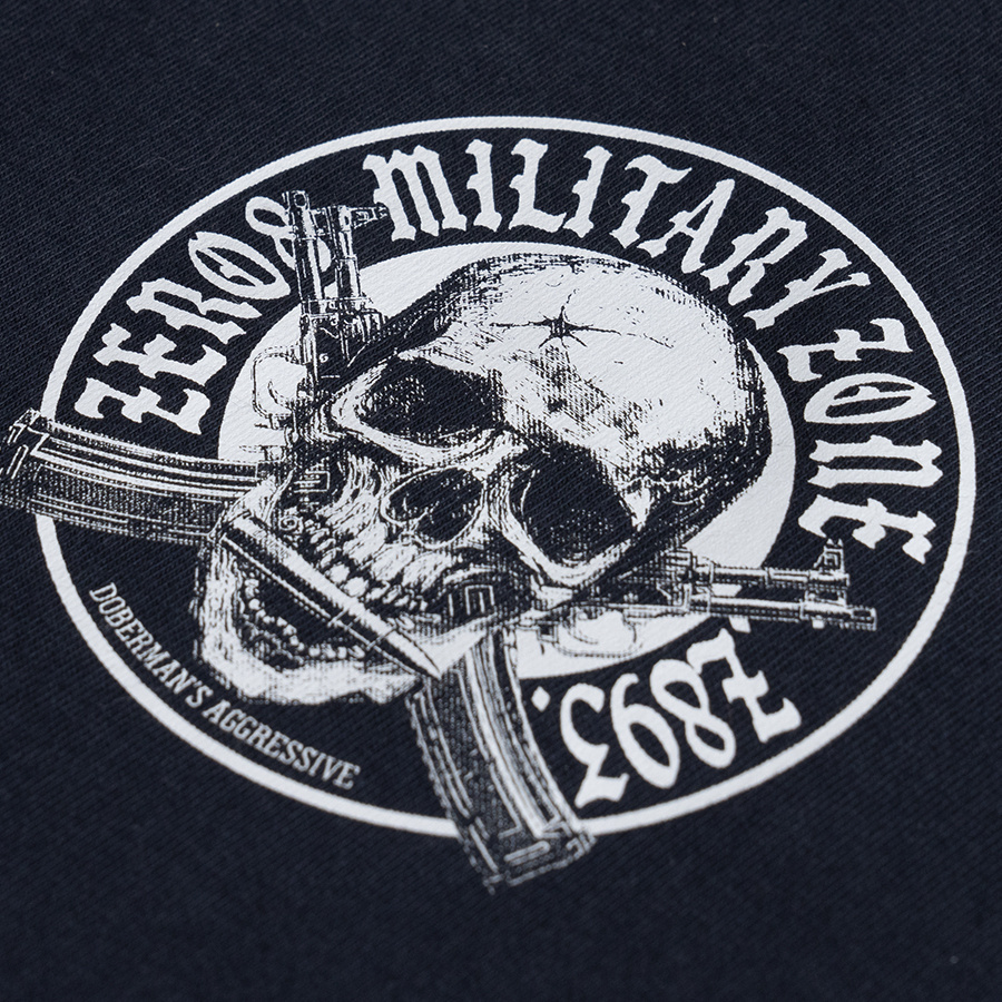 Koszulka MILITARY-ZONE od marki Dobermans Aggressive to konkretna propozycja dla osób, które szukają surowego, mocnego designu w codziennym wydaniu. Projekt opiera się na wygodnym, klasycznym fonie, który dzięki bawełnianej bazie i elastycznemu ściągaczowi przy dekolcie świetnie leży na sylwetce i zachowuje swój kształt nawet przy częstym noszeniu. Największą robotę robi tutaj potężna grafika na plecach – centralnie umieszczona czaszka na tle skrzyżowanych karabinów, otoczona napisem „Military Zone”, co nadaje całości autentycznego, militarnego sznytu. Na froncie, na lewej piersi, wylądował mniejszy, okrągły emblemat spójnie domykający całą kompozycję i nawiązujący do głównego motywu. To t-shirt, który nie potrzebuje zbędnych dodatków, by wyrazić zdecydowany charakter właściciela, stanowiąc solidny fundament każdej streetwearowej stylówki.