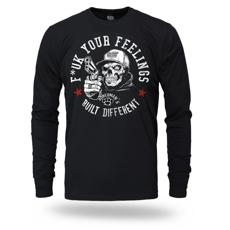 Męski Longsleeve TROUBLEMAKER od marki Dobermans Aggressive to konkretna propozycja dla osób szukających wyrazistego, ulicznego stylu. Model posiada klasyczny fason z długim rękawem oraz okrągły dekolt wykończony elastycznym ściągaczem, co gwarantuje trwałość i wygodę na co dzień. Cały projekt opiera się na dużej grafice na froncie – motyw czaszki w czapce z bronią w dłoni oraz hasło „F*ck Your Feelings – Built Different” nadają koszulce surowego charakteru. Wykonanie z wysokiej jakości bawełny sprawia, że longsleeve świetnie leży i sprawdza się jako fundament miejskiej stylizacji.