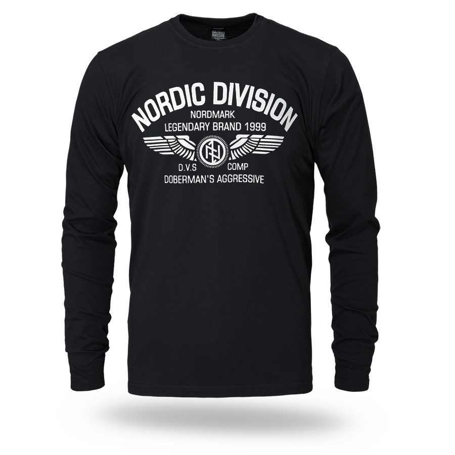 Męski Longsleeve N.DIVISION od marki Dobermans Aggressive to klasyczna propozycja dla osób ceniących nordycką estetykę w codziennym wydaniu. Na przodzie dominuje duży, biały nadruk z hasłem „Nordic Division – Nordmark Legendary Brand 1999” oraz motywem skrzydeł, co nadaje koszulce wyrazistego wyglądu. Model posiada okrągły dekolt wykończony elastycznym ściągaczem oraz długie rękawy, dzięki czemu dobrze układa się na sylwetce i zapewnia wygodę przez cały dzień. Wykonanie z wysokiej jakości bawełny gwarantuje trwałość materiału, czyniąc ten longsleeve solidną bazą dla miejskich stylizacji.