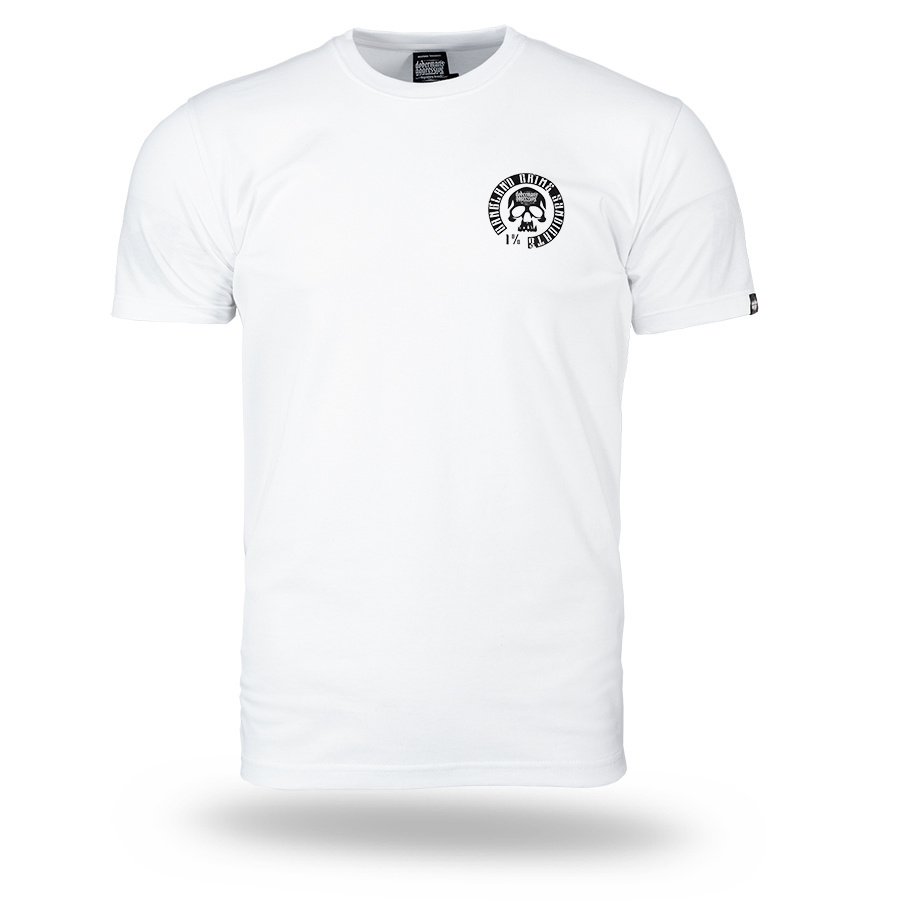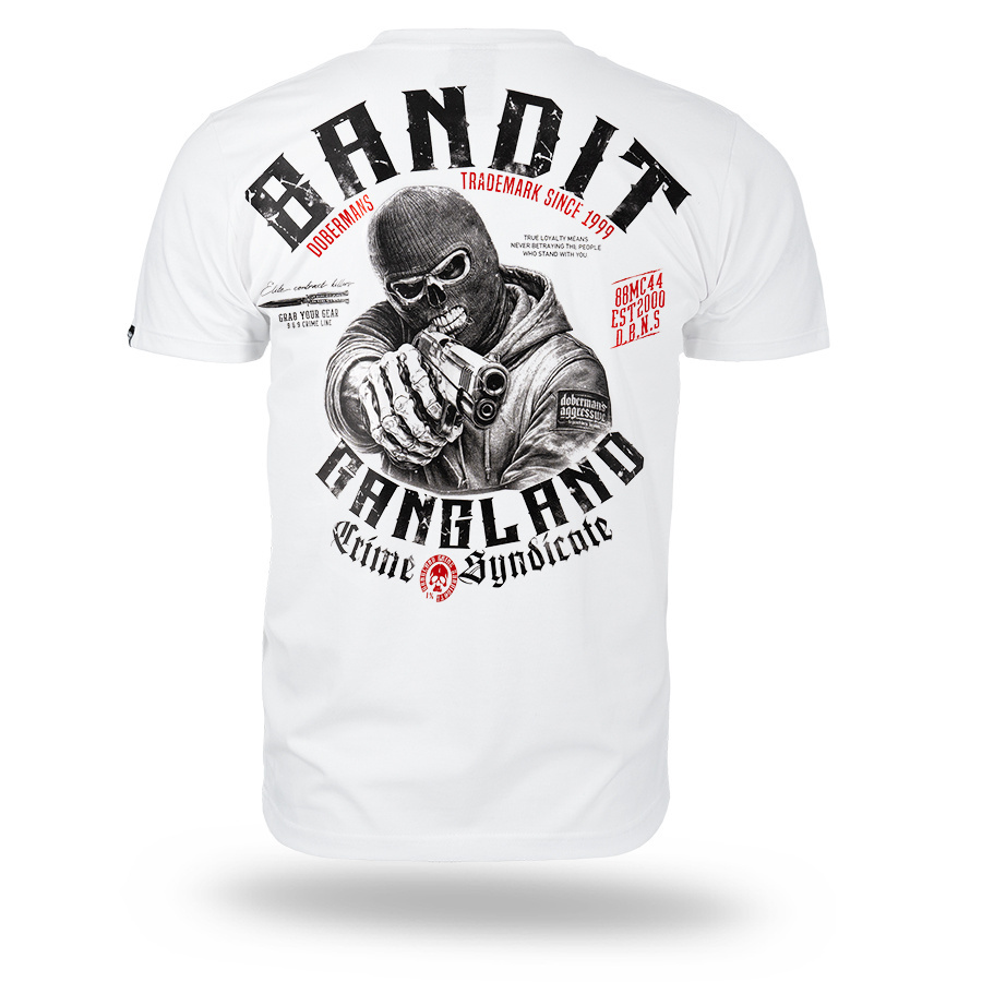 Koszulka BANDITZ od marki Dobermans Aggressive to wyrazista propozycja dla osób ceniących surowy, uliczny design i bezkompromisowy przekaz. Koszulka została wykonana w wygodnym, klasycznym fasonie z okrągłym dekoltem wykończonym elastycznym ściągaczem, co zapewnia komfort noszenia i trwałość materiału. Głównym punktem projektu jest duży, szczegółowy nadruk na plecach, przedstawiający zamaskowaną postać celującą z broni. Grafikę otaczają masywne napisy „Banditz Gangland Crime Syndicate” oraz charakterystyczne detale marki Doberman’s Aggressive, takie jak hasło „Trademark since 1999”, motywy noży oraz czerwone akcenty graficzne. Na przodzie, na wysokości piersi, umieszczono mniejszy, spójny nadruk, który dopełnia całą kompozycję. Ten dynamiczny projekt idealnie wpisuje się w kulturę streetwear, stanowiąc mocny i bezkompromisowy element codziennej stylizacji.