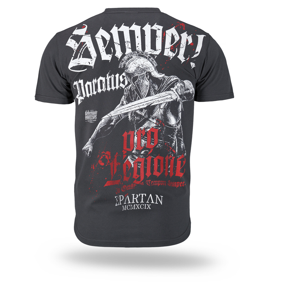 Koszulka SEMPER PARATUS od marki Dobermans Aggressive to propozycja dla osób ceniących wojskową symbolikę i styl marki Doberman’s Aggressive. Koszulka została zaprojektowana w wygodnym, klasycznym fasonie z okrągłym dekoltem, co sprawia, że idealnie nadaje się do codziennego użytkowania. Najważniejszym elementem projektu jest duży, dynamiczny nadruk na plecach. Przedstawia on uzbrojonego wojownika w hełmie z mieczem, otoczonego wyrazistymi napisami w gotyckim stylu: „Semper!”, „Paratus” oraz czerwonym hasłem „Pro Legione”. Na dole kompozycji widnieje dopisek „Spartan MCXCIX”. Z przodu, na klatce piersiowej, umieszczono niewielki, dyskretny nadruk, który spójnie nawiązuje do głównego motywu graficznego.
