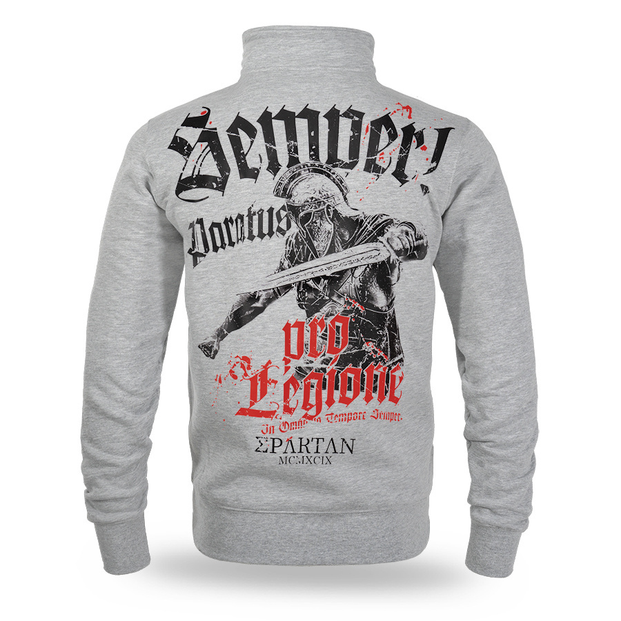 Rozpinana bluza SEMPER PARATUS ze stójką to funkcjonalna propozycja o silnym, militarnym charakterze, idealna dla osób ceniących gotowość do działania i surowy styl marki Doberman’s Aggressive. Model ten łączy klasyczny krój z praktycznymi rozwiązaniami, takimi jak zapięcie na zamek błyskawiczny oraz wysoka stójka, która skutecznie chroni przed chłodem. Głównym punktem projektu jest duży, dynamiczny nadruk na plecach. Przedstawia on uzbrojonego wojownika w hełmie, z mieczem w dłoni, otoczonego hasłami „Semper Paratus” oraz kontrastowym, czerwonym napisem „Pro Legione”.