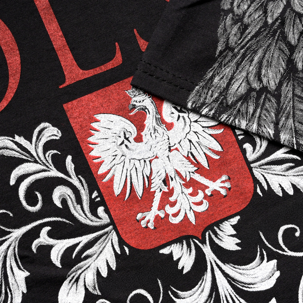 Tył koszulki został zaprojektowany z dbałością o każdy detal, łącząc klasyczną elegancję z narodową symboliką. W górnej części pleców znajduje się wyraźny napis Rzeczpospolita Polska, pod którym umieszczono godło Polski wpisane w ozdobny, biały ornament. Dzięki zastosowaniu wysokiej jakości technik drukarskich kolory są nasycone i odporne na spieranie, a czerwień i biel doskonale kontrastują z głęboką czernią materiału. Koszulka została wykonana z wysokogatunkowej bawełny, co gwarantuje komfort noszenia, przewiewność oraz trwałość nawet przy intensywnym użytkowaniu.